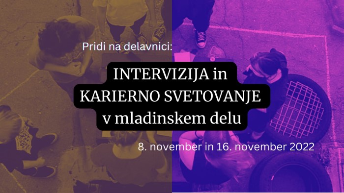 - Delavnica KARIERNO SVETOVANJE V MLADINSKEM DELU bo potekala v sredo, 16. novembra 2022, ob 18.30, v Mladinskem centru Vič (Tržaška c. 85, Ljubljana). Spoznali boste, kakšne vrste aktivnosti in metod obstajajo v kariernem svetovanju znotraj mladinskega dela.