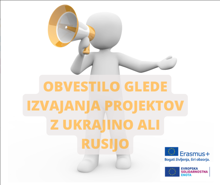 Vse organizacije, ki imajo trenutno sprejete gostiteljske ali pošiljajoče projekte z Ukrajino ali Rusijo v okviru katerega koli ukrepa programov Erasmus+: Mladina in Evropska solidarnostna enota, obveščamo, da bodo v teh dneh stopili z vami v stik skrbniki vaših sporazumov in vam predstavili možnosti glede nadaljnjega izvajanja projektov.