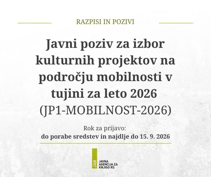 Predmet poziva je izbor izvajalcev in sofinanciranje kulturnih projektov v letu 2026 na področju mobilnosti v tujini.