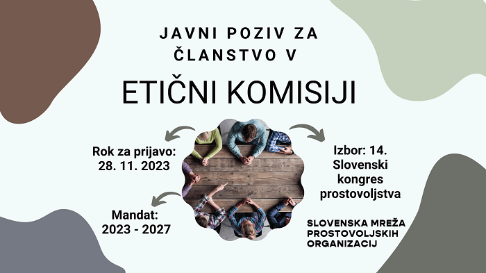 Kandidati_ke morajo biti člani_ce organizacij, ki so podpisnice Etičnega kodeksa organiziranega prostovoljstva. Novo sestavo etične komisije bodo izbrali oz. izvolili na 14. Slovenskem kongresu prostovoljstva 5. 12. 2023 v Ljubljani.