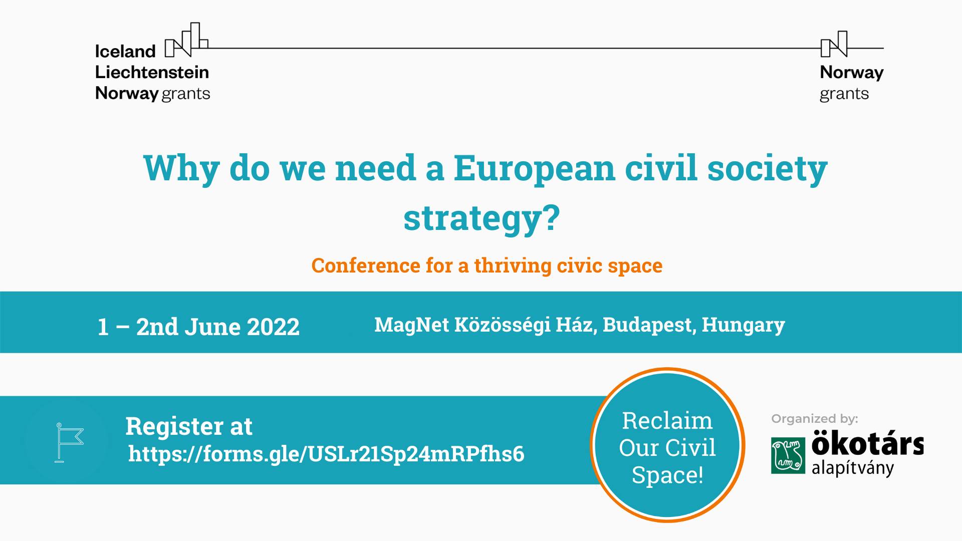Konferenco organizirajo civilnodružbene organizacije v okviru projekta Reclaim Our Civil Space!, ki obravnava zaskrbljujoče trende nazadovanja demokratičnih standardov in krčenja civilnodružbenega prostora v zadnjih letih, zlasti v Srednji in Jugovzhodni Evropi.