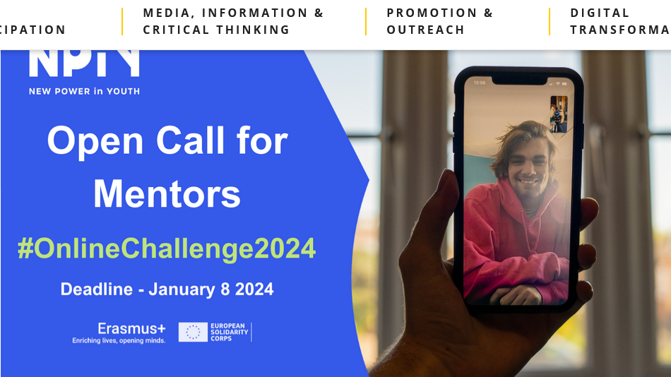 Strateško partnerstvo “New Power in Youth” (NPiY SNAC) išče mentorje za podporo spletnemu izzivu – Develop your quality E+/ESC project focused on youth participation, ki bo potekal med januarjem in marcem 2024.