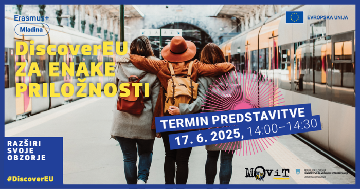 Zavod Movit vabi organizacije, ki delate z mladimi z manj priložnostmi, starimi med 18 in 21 let, da se jim pridružite na kratki predstavitvi ukrepa DiscoverEU, s posebnim poudarkom na omogočanju priložnosti za potovanje mladim z manj priložnostmi.