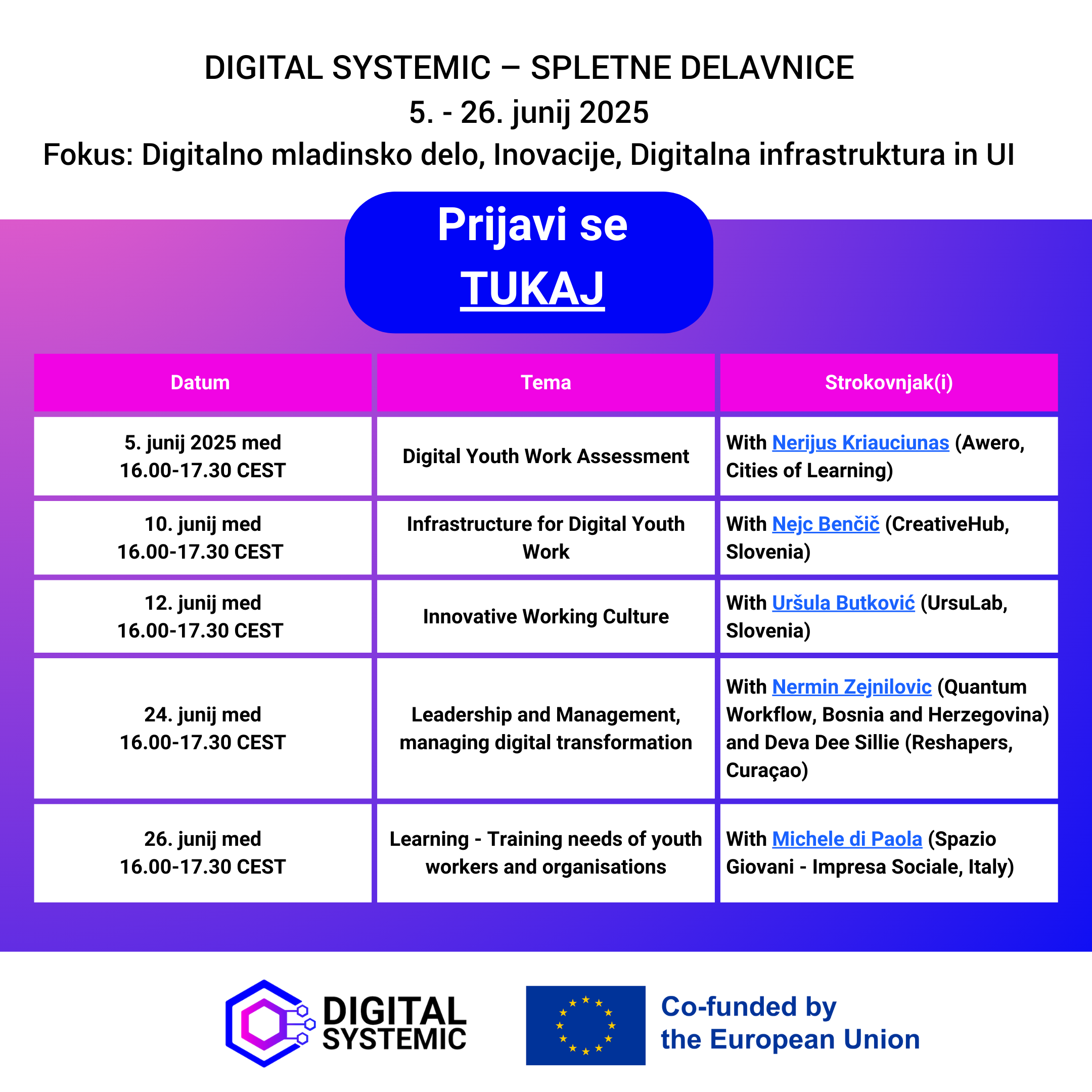 - 10. junij med 16.00 in 17.30 – Infrastructure for Digital Youth Work z Nejcem Benčičem iz Slovenije