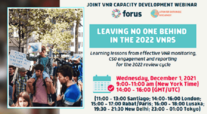 Forus in A4SD vabita na spletni seminar za razvoj zmogljivosti z naslovom “Ne pustimo nikogar zadaj v prostovoljnem nacionalnem pregledu (VNR) 2022. Učne lekcije iz učinkovitega spremljanja prostovoljnega nacionalnega pregleda (doseganja ciljev trajnostnega razvoja ), vključevanja organizacij civilne družbe in poročanja za cikel pregledov leta 2022”, ki bo v sredo, 1. decembra med 15.00 in 17.00 uro.