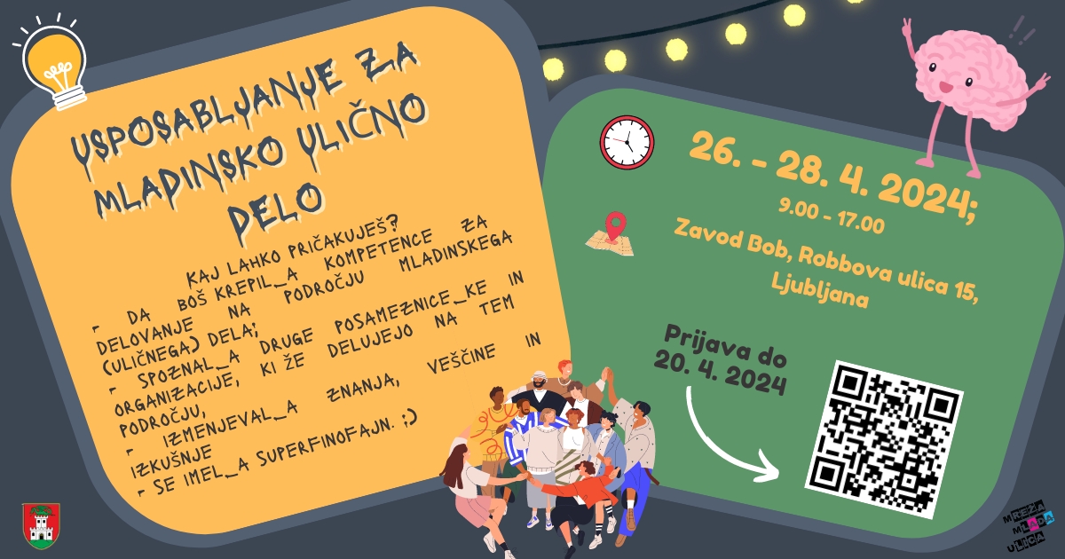 Mreža Mlada ulica tudi v letu 2024 izvaja usposabljanje za mladinske ulične delavke_ce. Z letnimi izvajanjem usposabljanj želijo okrepiti mladinsko (ulično) delo in predajati strokovne vsebine, ki so potrebne za uspešno delovanje na področju mladinskega uličnega dela.
