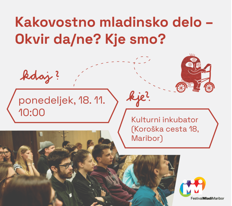 Mladinski kulturni center Maribor v sodelovanju z Mrežo MaMa vabi na delavnico “Kakovostno mladinsko delo – okvir da/ne? Kje smo?”, ki bo potekala 18. novembra 2024, med 10.00 in 15.00, v sklopu Festivala Mladi Maribor.