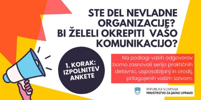 Zavod Nefiks vas vabi k izpolnitvi kratke ankete v okviru projekta “Sporočamo vsem: Krepitev komunikacije za večji družbeni vpliv”, saj želijo bolje razumeti, s katerimi izzivi se nevladne organizacije soočate pri komuniciranju.