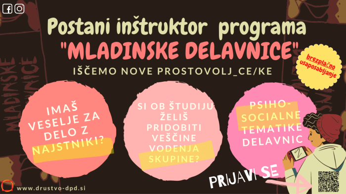 Društvo za preventivno delo vabi študente_ke ter vse mlade do 30 leta starosti, katere veseli delo z najstniki in bi bili pripravljeni eno šolsko leto nameniti prostovoljskemu delu, k izvajanju preventivnega projekta “Mladinske delavnice”.