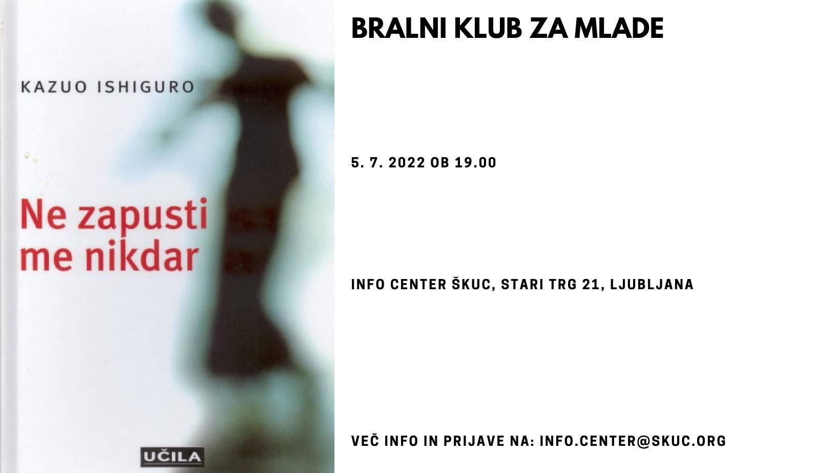 Info center Škuc vabi na bralni klub za mlade. Tokrat je na vrsti knjiga Ne zapusti me nikdar, avtorja Kazua Ishigura.