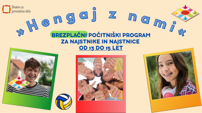Na Društvu za preventivno delo pripravljajo brezplačni počitniški program “Hengaj z nami” 2025, namenjen vsem najstnikom in najstnicam starim med 13 in 15 let (3. triada OŠ).