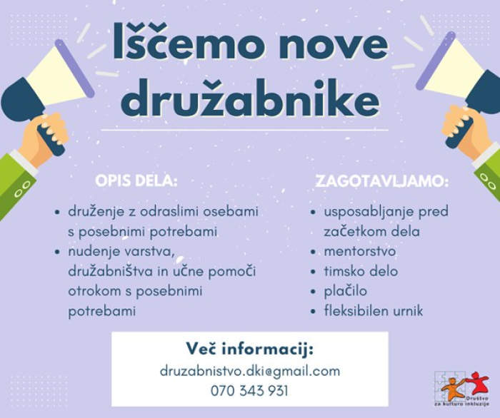 Društvo za kulturo inkluzije išče nove družabnike, ki bi želeli postati podpora in navdih otrokom ter mladostnikom s posebnimi potrebami.