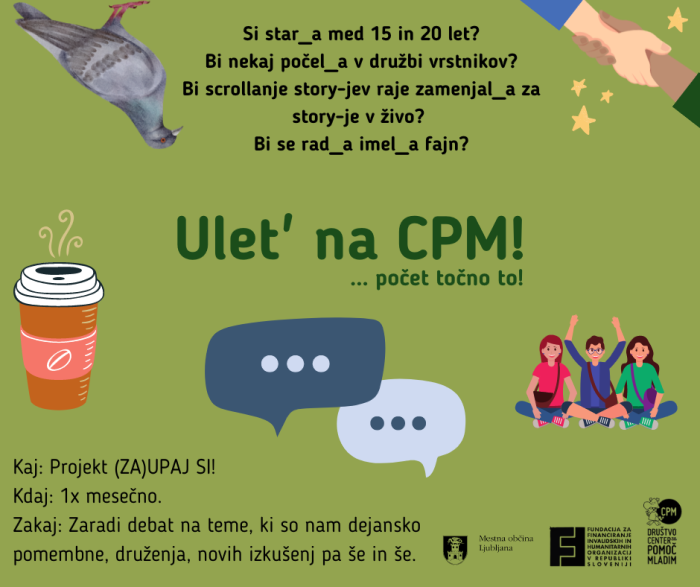 Iz želje po skupnem ustvarjanju in deljenju svojih misli/idej/interesov je v prostorih Društva CPM nastal projekt (ZA)UPAJ SI! Projekt je namenjen mladim med 15. in 20. letom starosti.