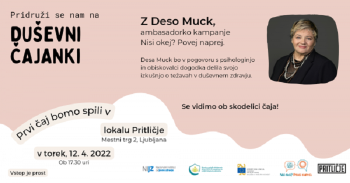 V sklopu nacionalne kampanje proti stigmatizaciji težav v duševnem zdravju: Nisi okej? Povej naprej, bo potekala prva Duševna čajanka z naslovom: Blazno resno o duševnem zdravju – duševna čajanka z Deso Muck.