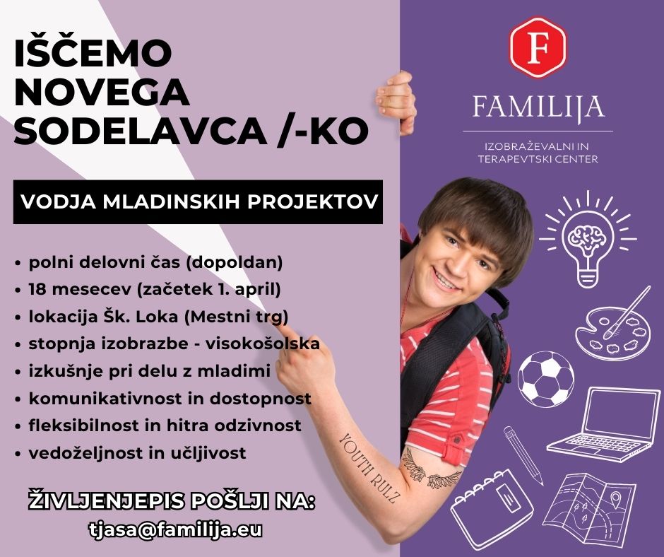 Zaradi nepričakovanega povečanega obsega dela na Familiji – izobraževalnem in terapevtskem centru zaposlijo mladinsko_ega delavko_ca.