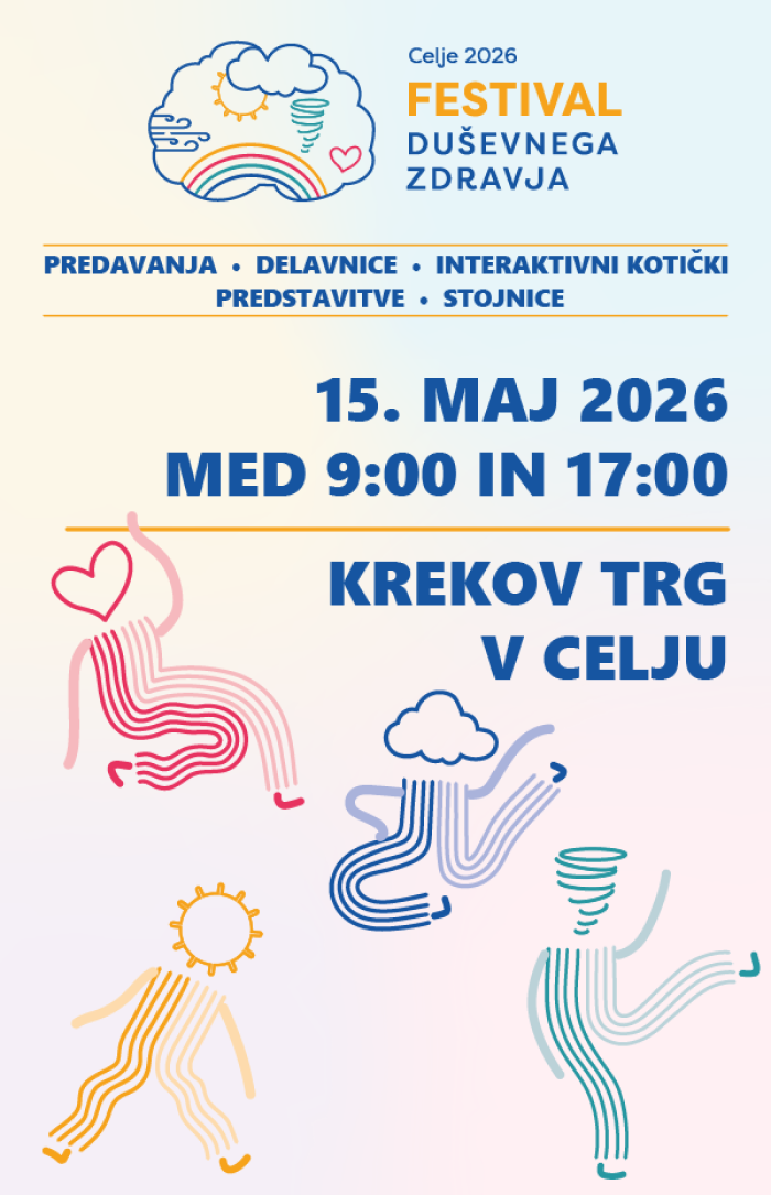 Festival duševnega zdravja, ki ga že četrto leto zapored organizira Nacionalni inštitut za javno zdravje v sodelovanju s partnerji, bo letos potekal 15. maja na Krekovem trgu v Celju. Festival je priložnost za raziskovanje različnih vidikov skrbi za duševno zdravje in preprečevanja duševnih stisk.