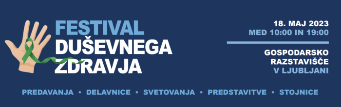 Nacionalni inštitut za javno zdravje obvešča, da se bo v četrtek, 18. maja 2023, med 10.00 in 19.00 na Gospodarskem razstavišču v Ljubljani odvijal Festival duševnega zdravja.