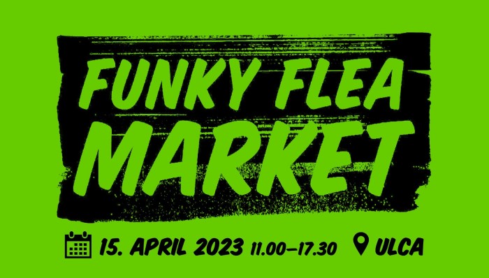 Mladinski center ULCA vabi na Funky Flea Market, najbolj funky bolšjaku v mestu, ki bo potekal v soboto, 15. 4. 2023, od 11.00 do 17.30 v Parku Navje. V primeru dežja se dobite v ULCI (podhod pod železniško postajo).