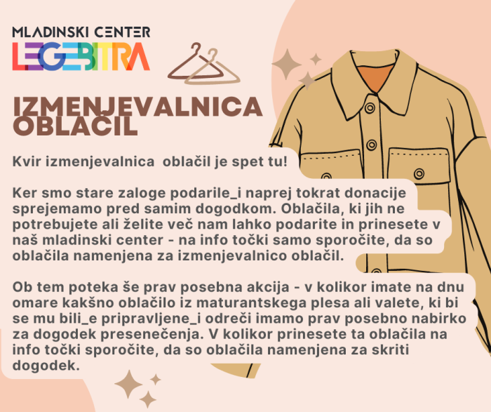 Legebitra vam ponuja jesensko in zimsko preobrazbo. Vabijo vas na kvir izmenjevalnico oblačil, kjer boste v varnem okolju lahko prebrskal_e, preizkusil_e in našli_e svoja nova najljubša oblačila.