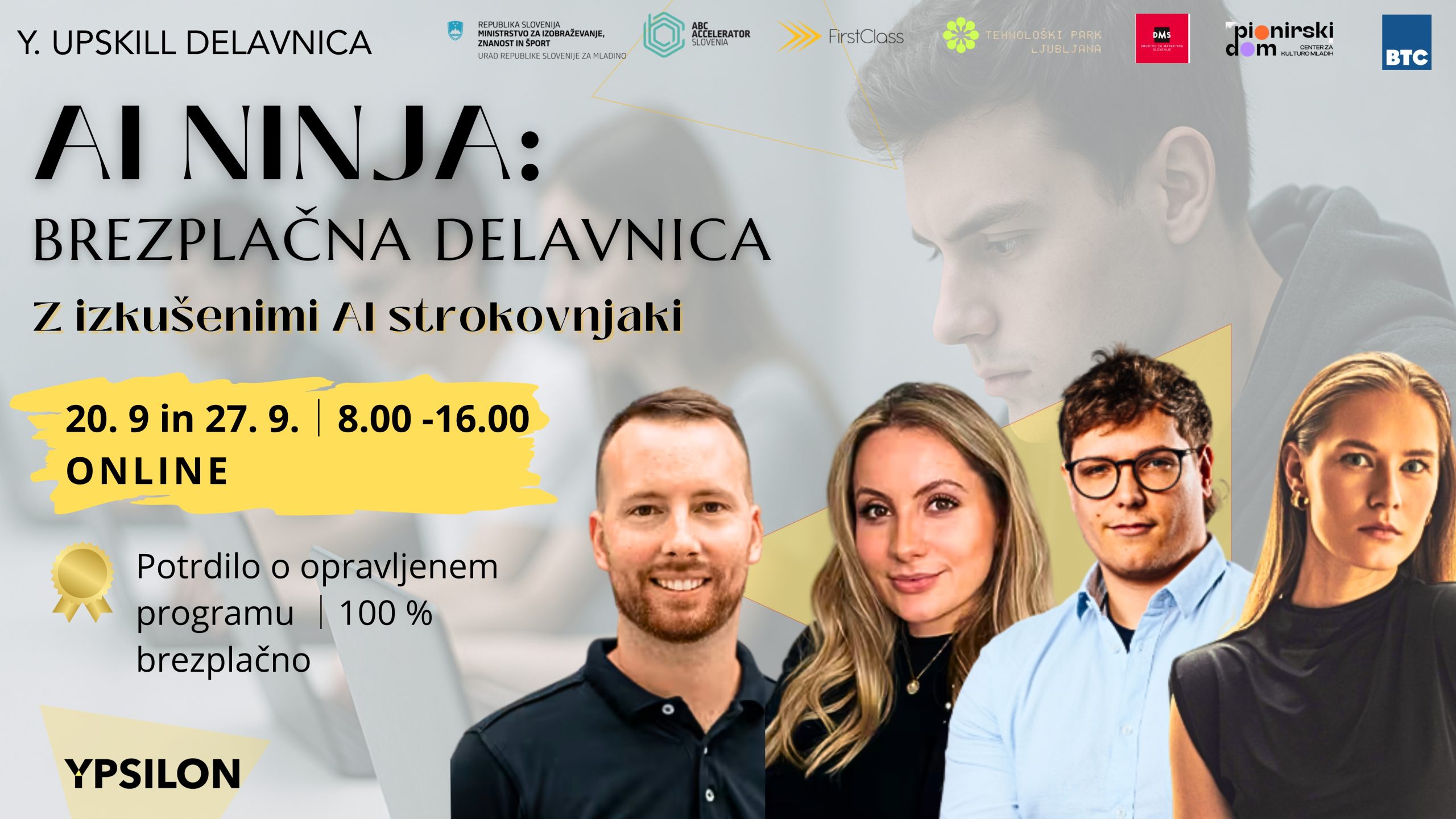 Program AI Ninja, ki ga izvaja podjetje FirstClass v sodelovanju z Ministrstvom za digitalno preobrazbo in Zavodom Ypsilon, mladim do 29. leta ponuja priložnost, da osvojijo praktična znanja in veščine, ki jih lahko takoj uporabijo v študiju, delu ali osebnih projektih.