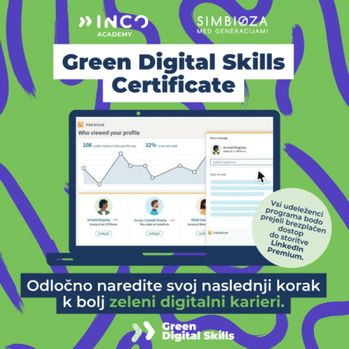 Simbioza v sodelovanju z Akademijo INCO z veseljem napoveduje začetek izvajanja certificiranega programa Green Digital Skills, brezplačnega spletnega tečaja, ki vas bo opremil z znanjem za ustvarjanje trajnostnih digitalnih rešitev.