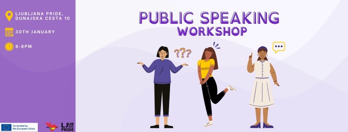 Društvo Parada ponosa vabi na delavnico javnega nastopanja, ki bo 30. januarja ob 18.00 v pisarnah Ljubljana Pride-a na Dunajski 10 v Ljubljani.