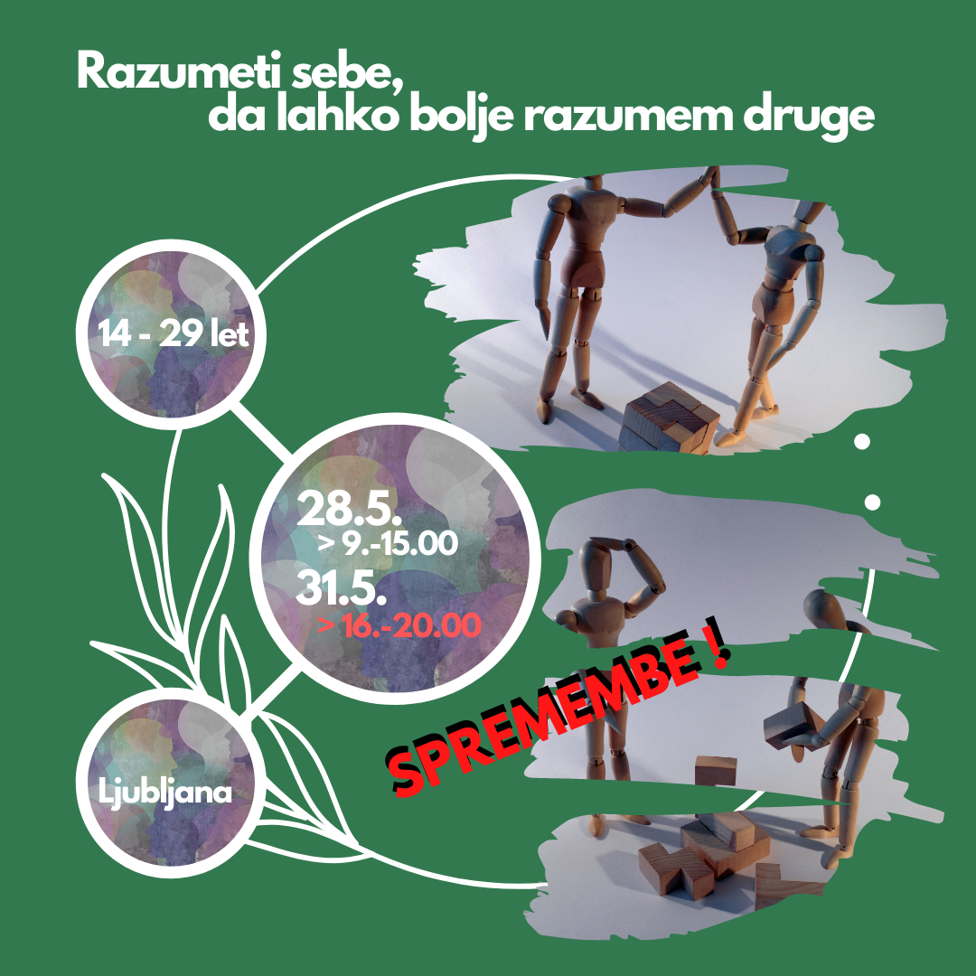Društvo Humanitas vabi vse, ki ste stari med 14 in 29 let in si želite globlje razumeti lastno delovanje, da se jim pridružite na majski delavnici “Razumeti sebe, da lahko bolje razumem druge”, kjer se boste skozi interaktivne metode dotaknili prepoznavanja naučenih predsodkov, stereotipov, področja strpnosti, vključenosti ter njihove manifestacije, tako v lastnem življenju, kot življenju drugih.
