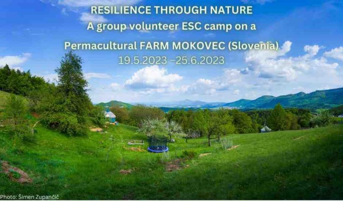 ESC delovni tabor z 12 udeleženci (tudi Slovenci) bo potekal na domačiji Mokovec od 19. 5. do 25. 6. 2023 (18. 5. dan prihoda, 26. 6. dan odhoda).