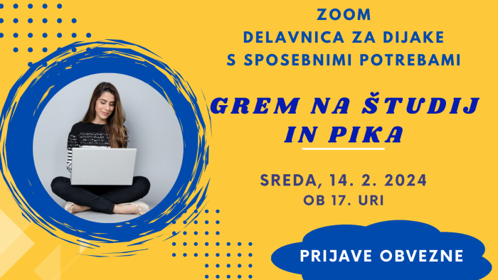 Društvo študentov invalidov Slovenije bo v sredo, 14. februarja 2024 ob 17.00 za dijake s posebnimi potrebami izvedlo delavnico “Grem na študij in pika”. Ta bo potekala preko Zooma.