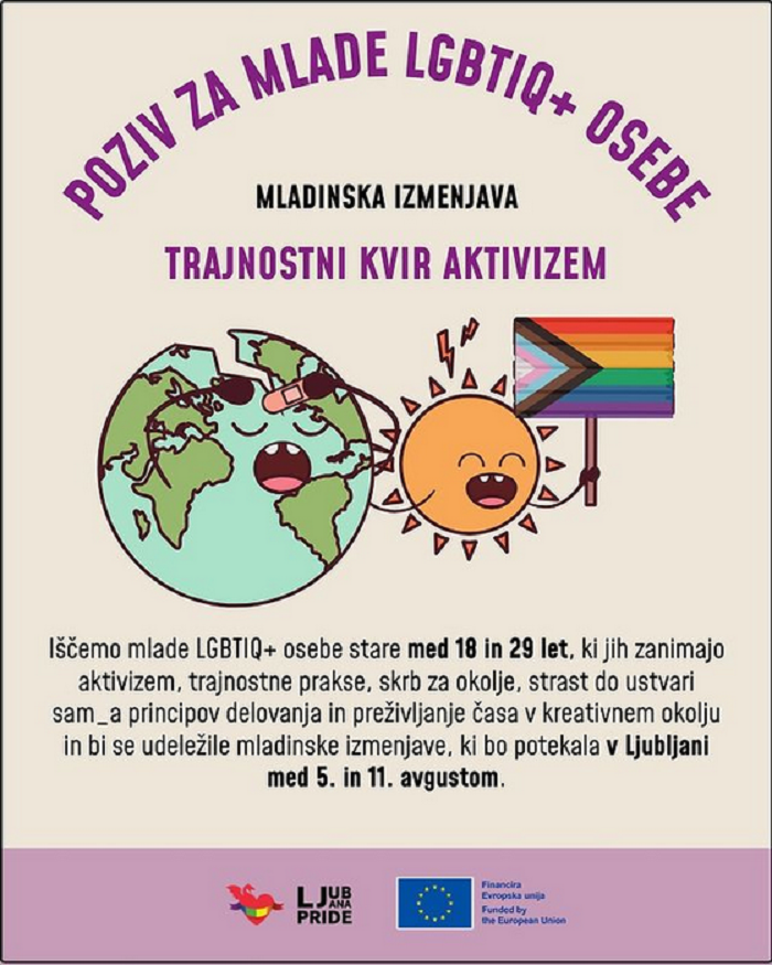 Društvo Parada ponosa išče mlade LGBTIQ+ osebe stare med 18 in 29 let, ki bi sodelovale na mladinski izmenjavi Trajnostni kvir aktivizem, ki bo potekala v Ljubljani med 5. in 11. 8. 2024.