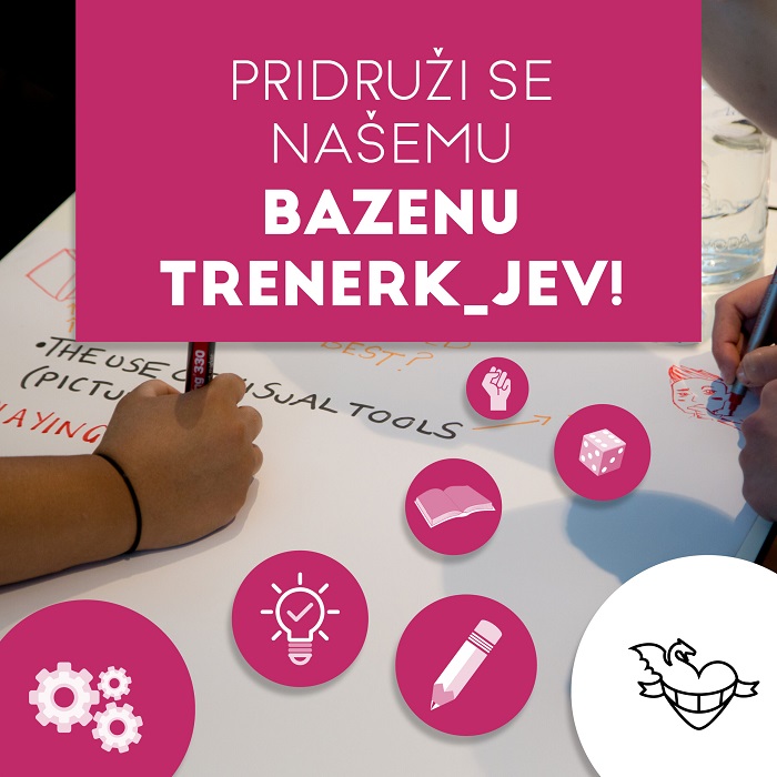 Društvo Parada ponosa vas vabi, da se vključite v delovanje bazena trenerk_jev. Bazen trenerk_jev sestavlja ekipa usposobljenih in motiviranih trenerk_jev neformalnega izobraževanja, ki vse_i prihajajo iz LGBTIQ+ skupnosti. Pri svojem trenerskem delu izhajajo iz metodoloških pristopov neformalnega izobraževanja in mladinskega dela.