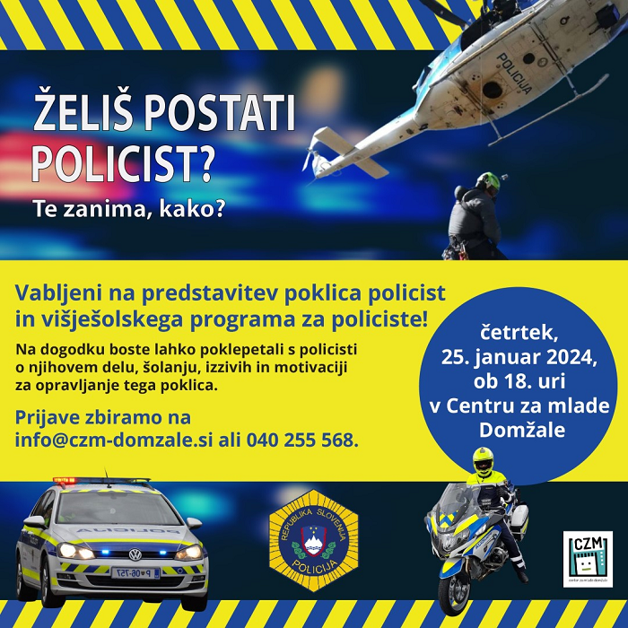 Center za mlade Domžale vabi na predstavitev poklica policist in višješolskega programa za policiste, ki bo v četrtek, 25. 1. 2024, ob 18.00 v Centru za mlade Domžale.