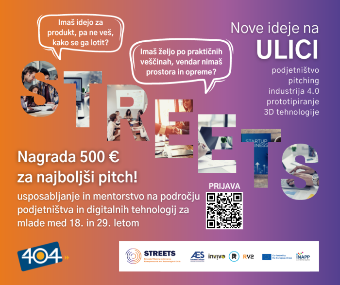 Mladinski tehnološko – razvojni center 404 v sodelovanju z RV2, AES, INVIVO, RA Porin, INAPP ter Evropsko unijo prireja projekt STREETS na območju Ljubljane, med 28. novembrom in 2. decembrom, ki je namenjen vsem mladim med 18. in 29. letom.