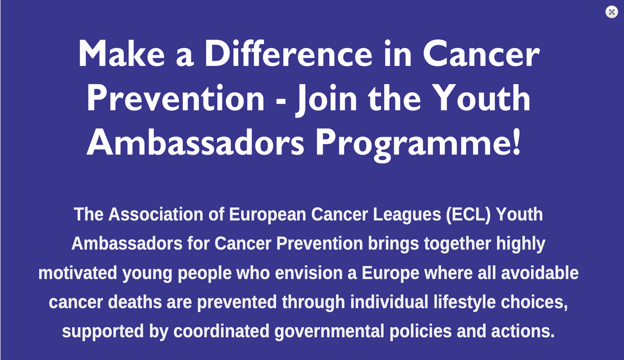 Program ECL Youth Ambassadors združuje študente in mlade strokovnjake z različnih področij, ki jih zanima zagovorništvo in javno zdravje. Promovirajo Evropski kodeks proti raku (ECAC) ter zastopajo ECL v svojih državah s številnimi kreativnimi in izvirnimi dejavnostmi.