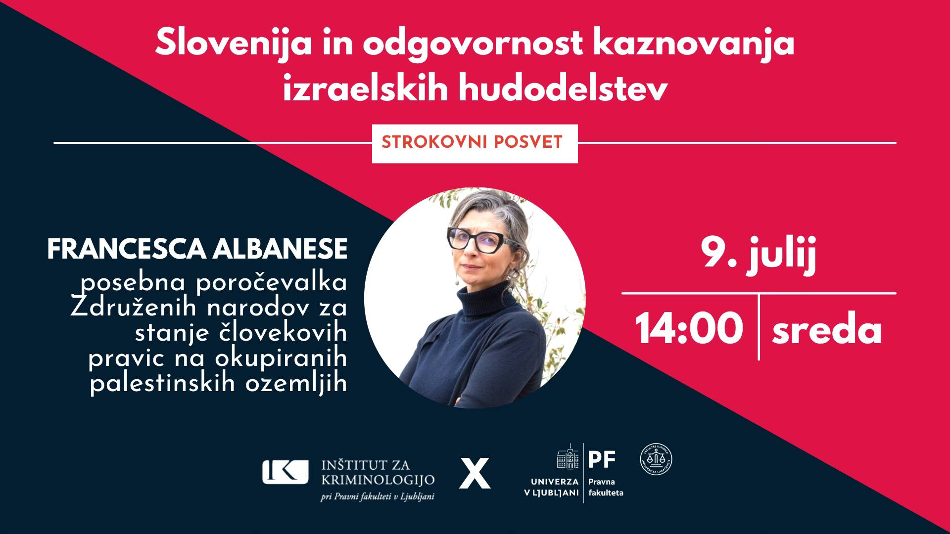 Dogodek je organiziran v luči obiska posebne poročevalke Združenih narodov za stanje človekovih pravic na okupiranih palestinskih ozemljih, mednarodne pravnice Francesce Albanese. Potekal bo od 14.00 dalje.