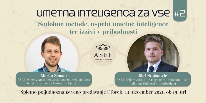 ASEF štipendista generacije 2021 Marko Zeman in Blaž Stojanovič bosta 7. decembra in 14. decembra ob 19. uri na enostaven in širši javnosti dostopen način predstavila zelo aktualno temo. Na prvem predavanju, ki bo potekalo v torek, 7. decembra, ob 19. uri, bosta mlada predavatelja predstavila razvoj umetne inteligence in podala osnove strojnega učenja. Na drugem predavanju, ki bo sledilo v torek, 14. decembra, ob 19. uri, pa bosta govorila o sodobnih metodah, uspehih umetne inteligence ter izzivih v prihodnosti.