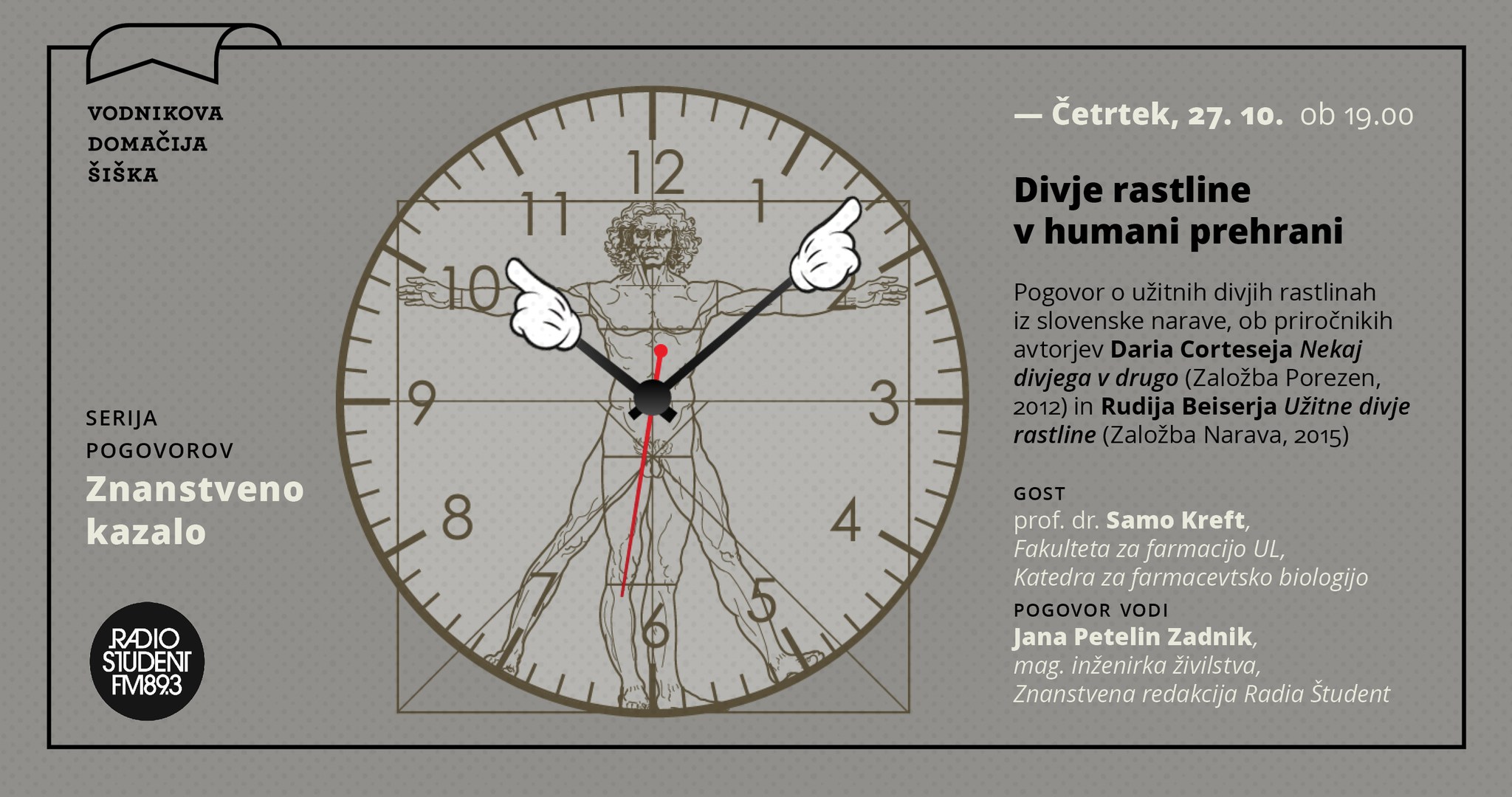 Tokratni pogovor in razpravo namenjajo užitnim divjim rastlinam, ki jih lahko najdejo v naravi, v Sloveniji. Gost večera bo prof. dr. Samo Kreft s Fakultete za farmacijo Univerze v Ljubljani (Katedra za farmacevtsko biologijo). Dogodek vodi Jana Petelin Zadnik, mag. inženirka živilstva (Znanstvena redakcija Radia Študent). V pogovoru s poznavalcem se bo posvetilo aktualnim, sezonskim, divjim, a užitnim rastlinam in njihovi uporabi v vsakodnevni prehrani. Govora bo tudi o učinkih rastlin na človeško zdravje ter njihovem pravilnem nabiranju in prepoznavanju. Z udeleženci se bo delilo recept ali dva, podučilo pa se bo tudi, kako se izogniti morebitni zastrupitvi oziroma kako ukrepati, če se nam ta zgodi.