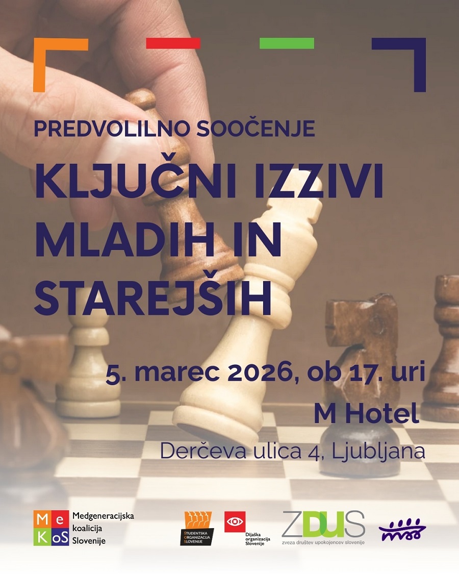 Medgeneracijska koalicija Slovenije (MeKoS), ki ji v trenutnem obdobju predseduje MSS, vabi na predvolilno soočenje o ključnih izzivih mladih in starejših v Republiki Sloveniji. MeKoS združuje Mladinski svet Slovenije (MSS), Dijaško organizacijo Slovenije (DOS), Študentsko organizacijo Slovenije (ŠOS) in Zvezo društev upokojencev Slovenije (ZDUS). Skupaj predstavljajo glas dveh najširših – mladi in starejši predstavljajo okrog polovico prebivalcev Slovenije – hkrati pa tudi najbolj ranljivih generacij v naši družbi.