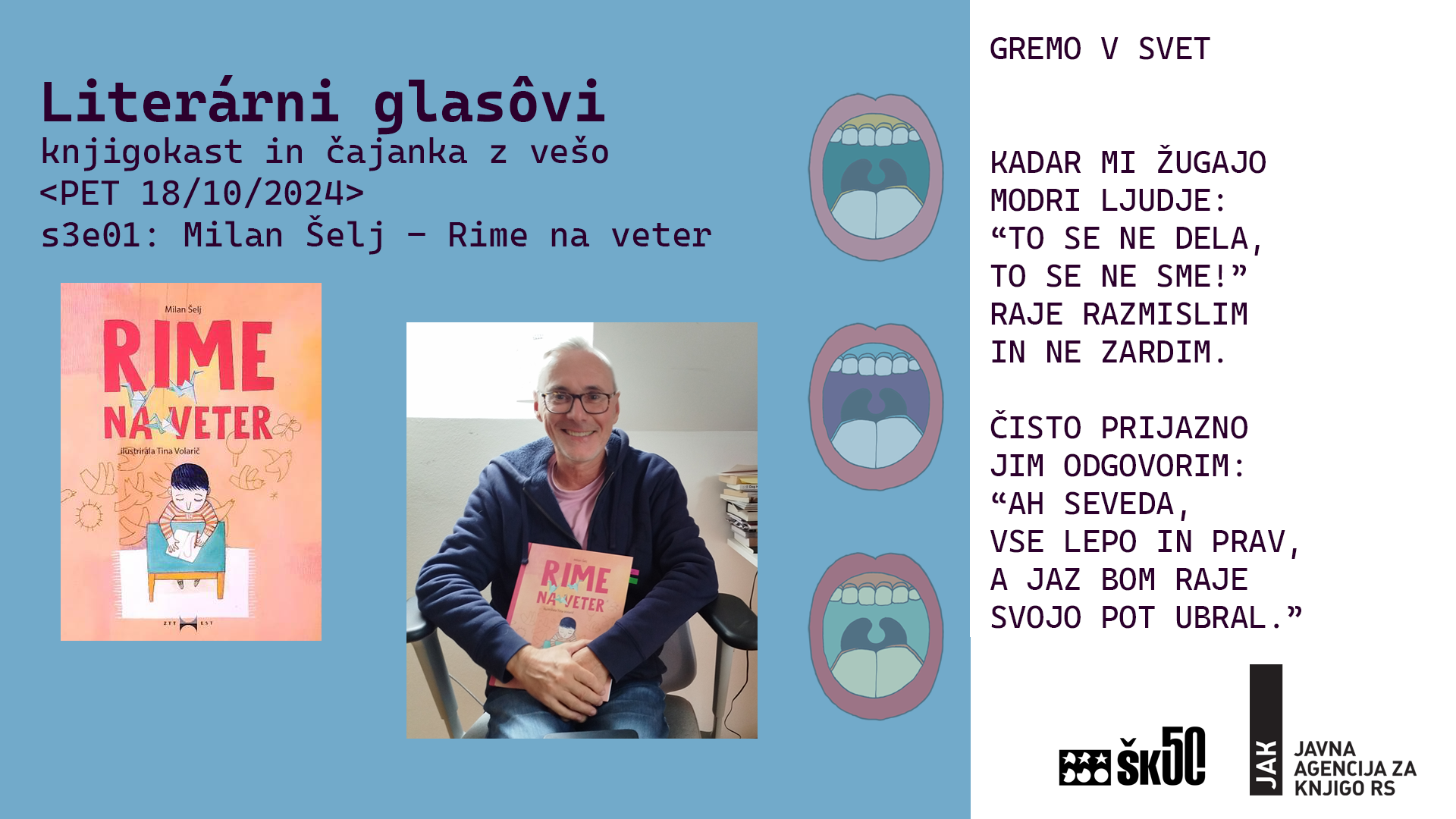 V novi sezoni Literarnih glasov se od čajanke do piknika do pesniških delavnic knjižna veša Tanja Matijašević smuka okoli Milana Šelja, ki je pred kratkim izdal že drugo pesniško zbirko za otroke z naslovom Rime na veter. Rime na veter so bile pred kratkim nominirane za nagrado Kristine Brenkove kot najboljša slikanica za otroke 2024.