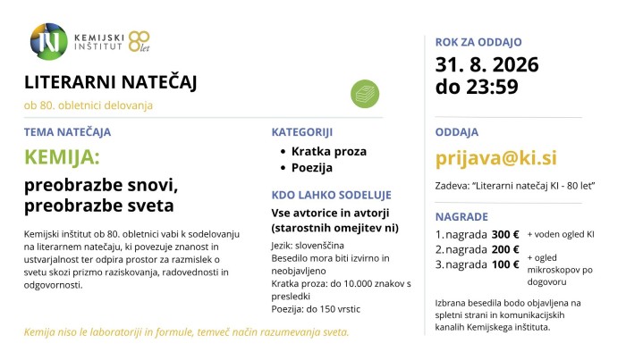 Kemijski inštitut ob 80-letnici delovanja vabi k sodelovanju na literarnem natečaju, s katerim želijo povezati znanost in ustvarjalnost ter odpreti prostor za razmislek o svetu skozi prizmo raziskovanja, radovednosti in odgovornosti.