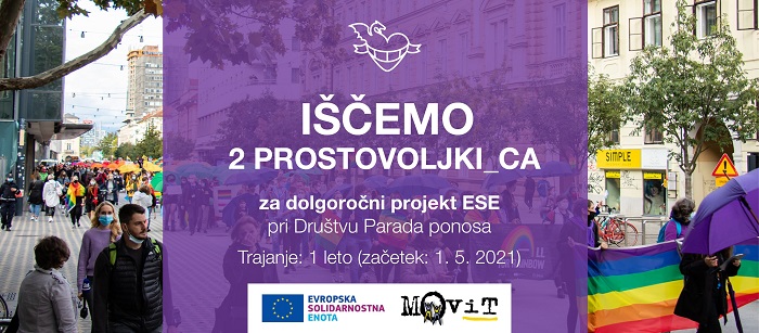 Društvo Parada ponosa išče 2 osebi za dolgoročni projekt ESE (Evropska solidarnostna enota).