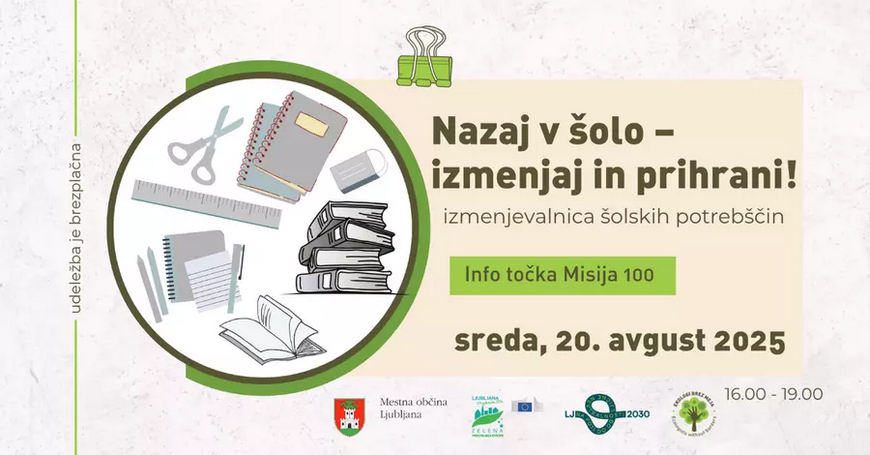V Info točki Misija 100 na Pogačarjevem trgu 3 bo v sredo, 20. avgusta 2025, med 16.00 in 19.00 potekala izmenjevalnica šolskih potrebščin.