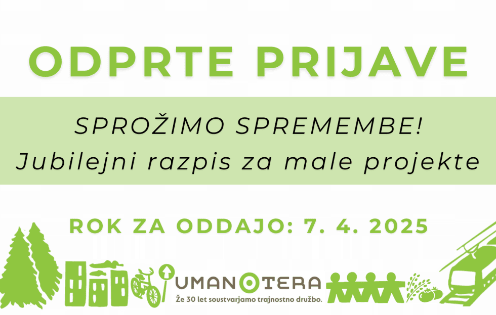 SLOGA Umanotera letos obeležuje 30 let svojega delovanja. Ob tej priložnosti objavlja enkratni jubilejni razpis “Sprožimo spremembe”, s katerim želijo donacije nameniti tudi drugim projektom, ki bodo prispevali k udejanjanju pravičnega podnebnega prehoda in s tem podprli njihovo vizijo pravične družbe.