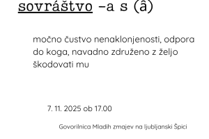 VečInfo center Škuc vabi na otvoritev razstave sovráštvo –močno čustvo nenaklonjenosti, odpora do koga, navadno združeno z željo škodovati mu, ki bo potekala 7. 11. 2025 ob 17.00 v Govorilnici zavoda Mladi zmaji na ljubljanski Špici.