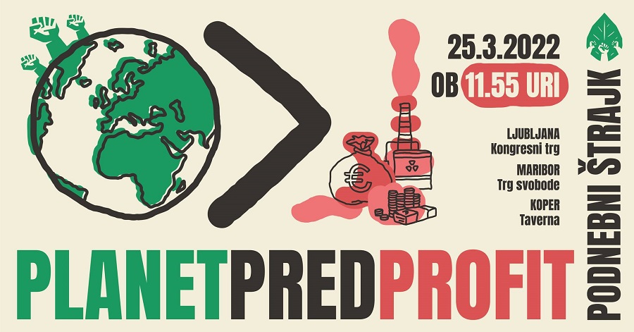 V petek, 25. 3. 2022, ob 11.55 se bodo na ulicah in trgih večjih mest po Sloveniji odvijali vseslovenski podnebni protesti.