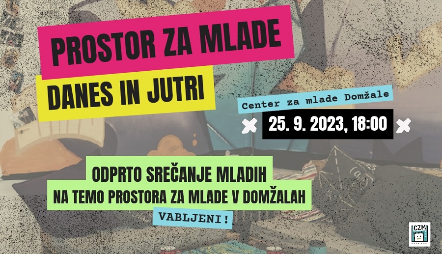 Center za mlade Domžale pripravlja srečanje mladih na temo mladinskega prostora za mlade, ki bo v ponedeljek, 25. 9. 2023, ob 18.00 v Placu za mlade v Centru za mlade Domžale.
