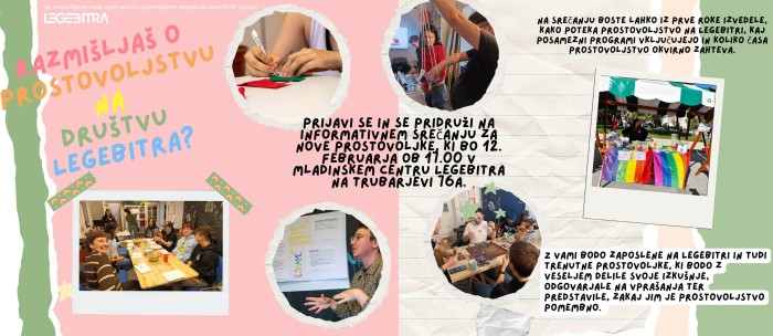 Društvo Legebitra vas vabi, da se jim pridružite na informativnem srečanju za nove prostovoljke, ki bo 12. februarja ob 17.00 v Mladinskem centru Legebitra, na Trubarjevi 76a.