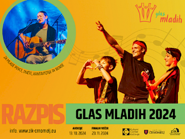Zavod za izobraževanje in kulturo Črnomelj je objavil razpis za Glas mladih 2024, najstarejši festival za mlade glasbenike v Sloveniji, ki bo zaradi obnove Kulturnega doma Črnomelj potekal v Kulturnem centru Kočevje. Prijavite se lahko do 6. 10. 2024.