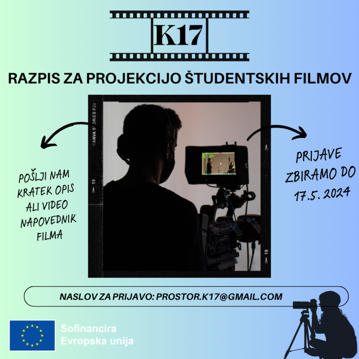 Želijo si predvajati tudi filme študentskih ustvarjalcev_k, zato vas vabijo, da jim kratek opis ali video napovednik filma pošljete na elektronski naslov prostor.k17@gmail.com do 17. 5. 2024.