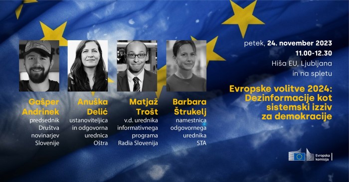 Predstavništvo Evropske komisije v Sloveniji vabi na razpravo Evropske volitve 2024: Dezinformacije kot sistemski izziv za demokracije, ki bo v petek, 24. novembra 2023, med 11.00 in 12.30 v Hiši Evropske unije (Dunajska 20, Ljubljana). Dogodek bo potekal v sodelovanju s festivalom Naprej / Forward.